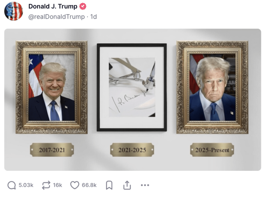 在特朗普发布以上言论前一日,即16日,他在Truth Social上发布了一张图片。图片中有三张相,第一张是他第一任期的官方肖像照,第二张是一支自动签名笔正在签署“乔·拜登”的名字,第三张是特朗普第二任期的官方肖像照,以讽刺拜登在总统任期内使用自动签名笔代签。