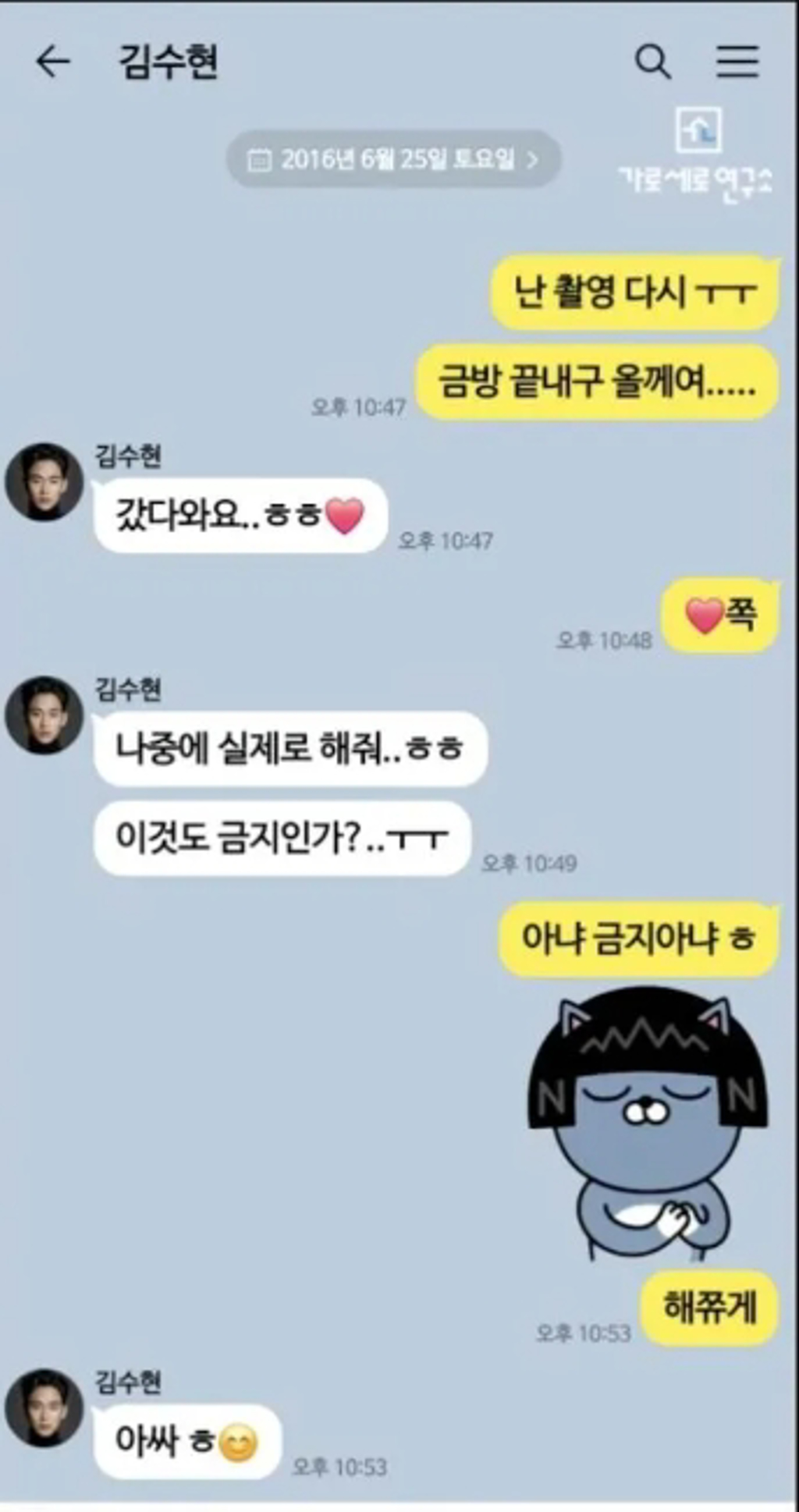 遗属提供金赛纶过去与金秀贤交往的私密对话与书信,其中一则对话纪录时间为2016年6月25日,内容可见,金赛纶先是传出讯息向金秀贤报备行程,说明自己即将要去工作:“我又要去拍摄了(哭哭),我会赶快结束然后来找你……”,金秀贤则说:“去吧,嘿嘿”并附上爱心贴图来安慰女方。