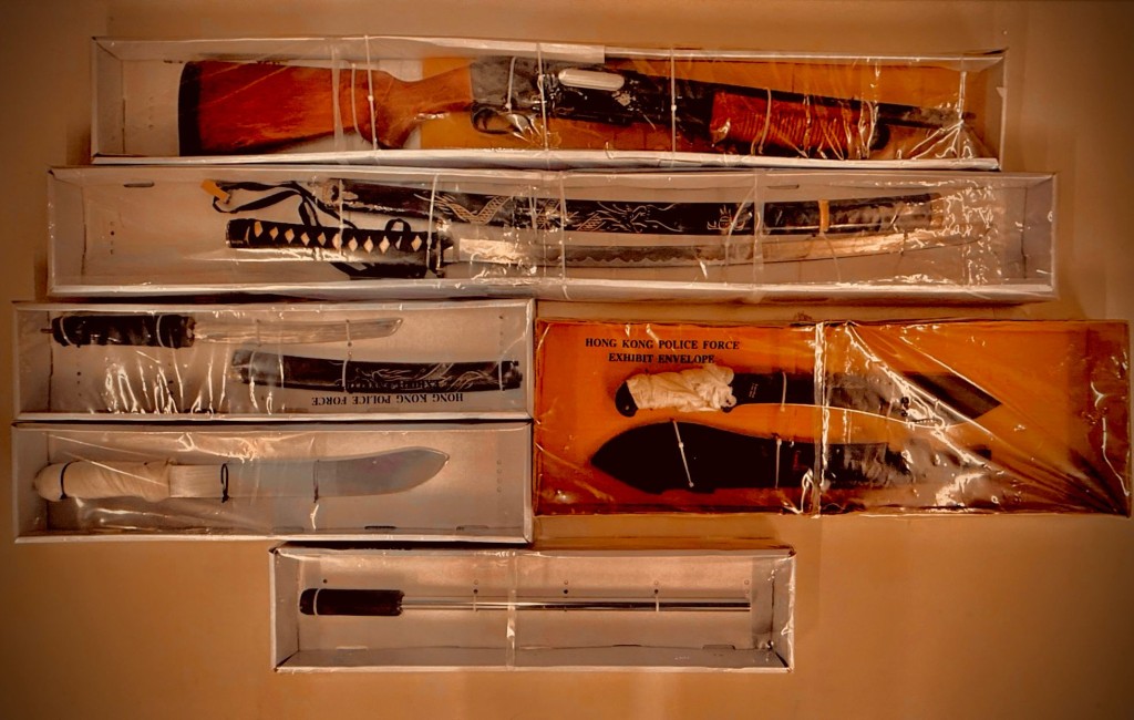 ▲警方检获一支仿制枪械及多把开山刀和日本刀。 警方图片