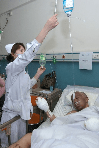 ▲护士正在护理25岁的伤者李晓东。新华社