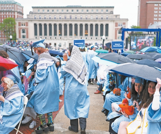 哥伦比亚大学毕业典礼场外有数十名学生举行反以色列示威,抗议人士焚烧毕业证书、高呼口号,又与到场维持秩序的警员发生冲突,至少两人被捕。哥大代理校长希普曼(Claire Shipman)致辞时提到被移民执法人员拘捕的国际学生哈利勒(Mahmoud Khalil),引起部分学生不满。