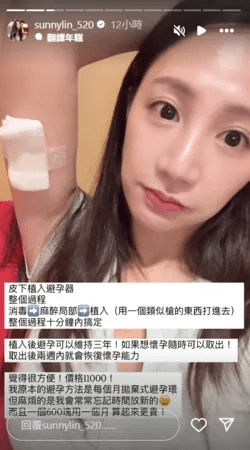 林采缇21日在IG限时动态留言问大家都用什么方法避孕?其后林采媞说:“但因为我自己也不爱另一半戴保险套的触感!”她又指会忘记吃事前避孕药,所以决定花1万1千元台币植入避孕器。