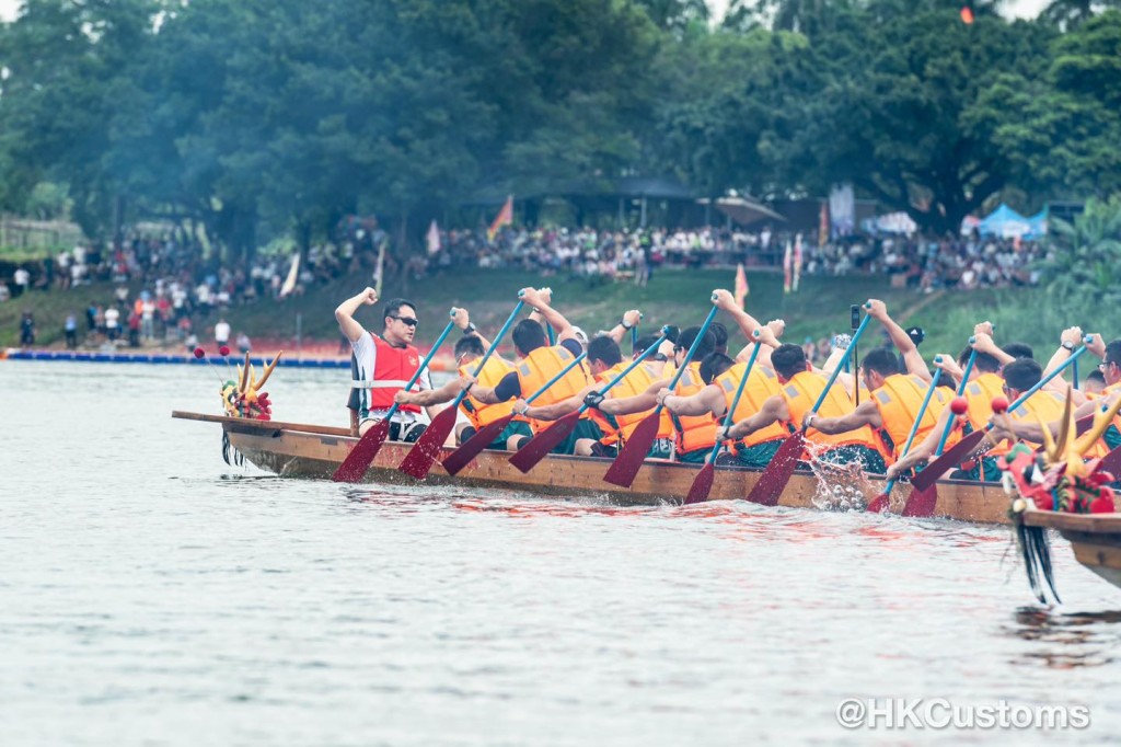 ▲陈子达坐镇龙舟之首,与海关健儿一同在传统大型龙舟挥桨。 海关FB