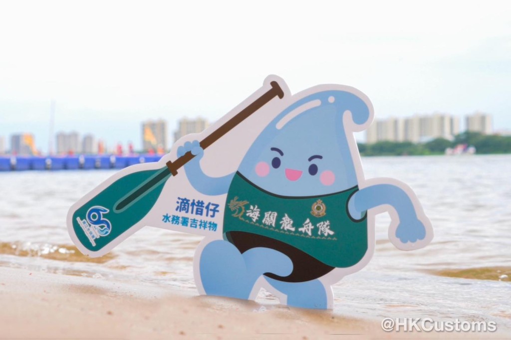 ▲这次海关龙舟队亦带同水务署吉祥物滴惜仔回乡东江。海关FB