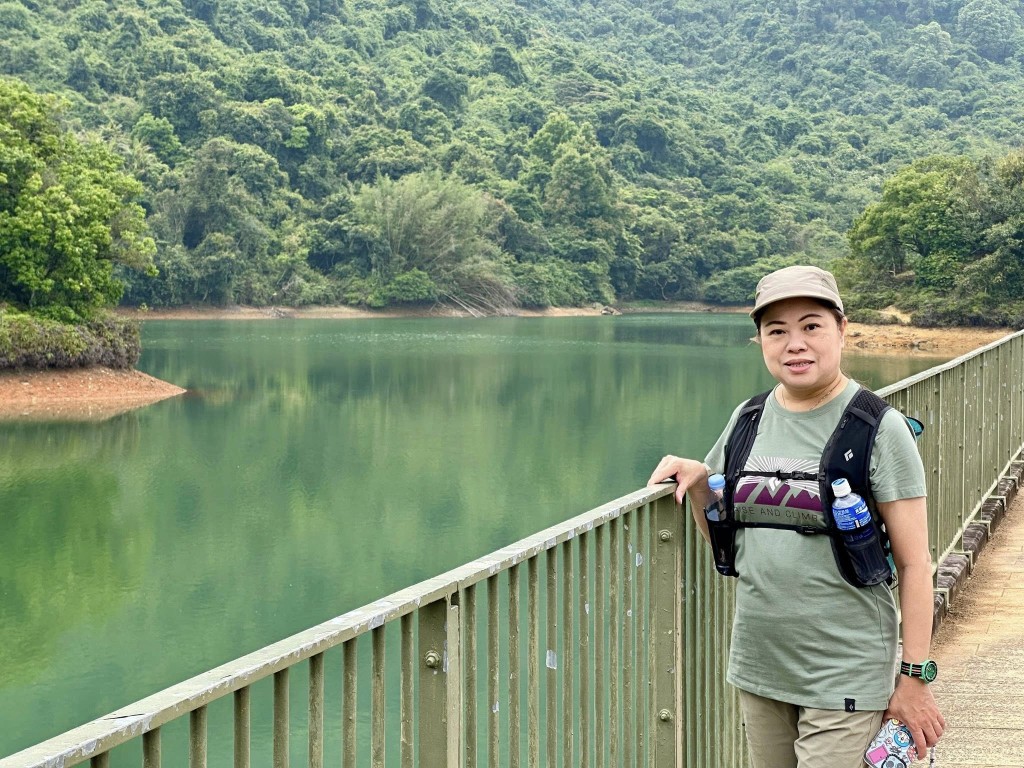 从罗淑佩上载到社交平台的多张相片可见,她行经河背越野单车径、甲龙林径,河背水塘家乐径等,只见她穿上一身绿色行山装束,手持行山杖,孭住同色系背囊、行山鞋,头戴一顶草绿色防晒帽,衬到绝。