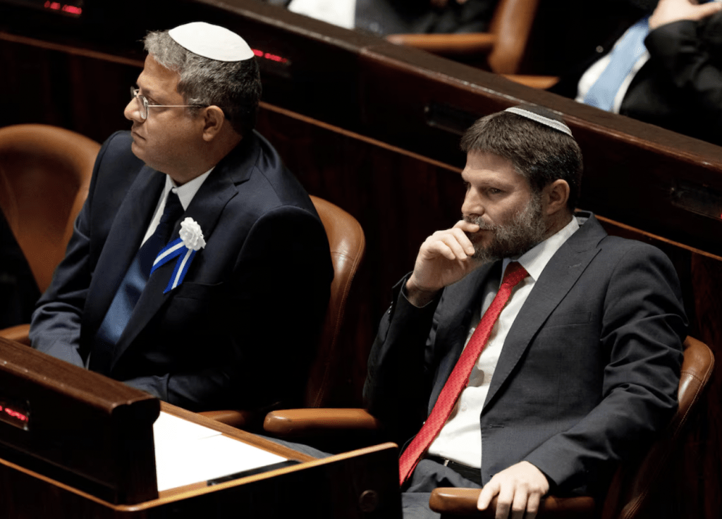 ▲2022 年 11 月 15,格维尔(中)和斯莫特里奇(右)出席在耶路撒冷议会举行的以色列新议会宣誓就职仪式。路透社