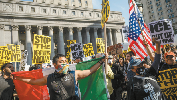 下午6时刚过,数百人涌入蜿蜒穿过曼哈顿下城联邦大楼所在街道,向北行进约一哩前往瓦里克街(Varick Street)上另一移民法庭。他们举着亮黄色标语,上面用西班牙语和英语写着“ICE滚出纽约”。