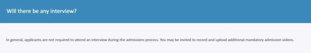 一般来说,申请者在录取过程中不需要参加面试,但可能会被要求录制并上传额外的强制性入学视频。