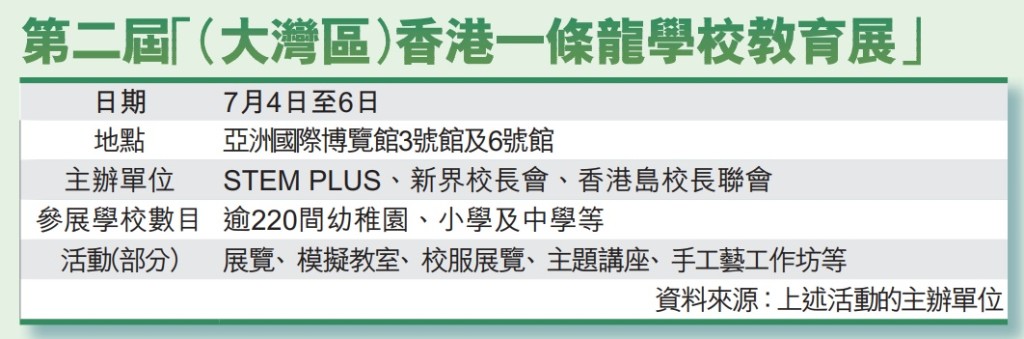 第二届“(大湾区)香港一条龙学校教育展”由STEM PLUS、新界校长会及香港岛校长联会合办,将于7月4日至6日在亚洲国际博览馆举行。STEM PLUS首席执行官刘靖玮表示,今届展览已有超过220间幼儿园、中小学和高等院校报名参展,冀让家长掌握准确的教育及入学信息。他指出,为了让人才家长获取最新信息,大会将继续提供一站式报名平台,并让家长通过“微信小程序”,向学校提交入学申请。