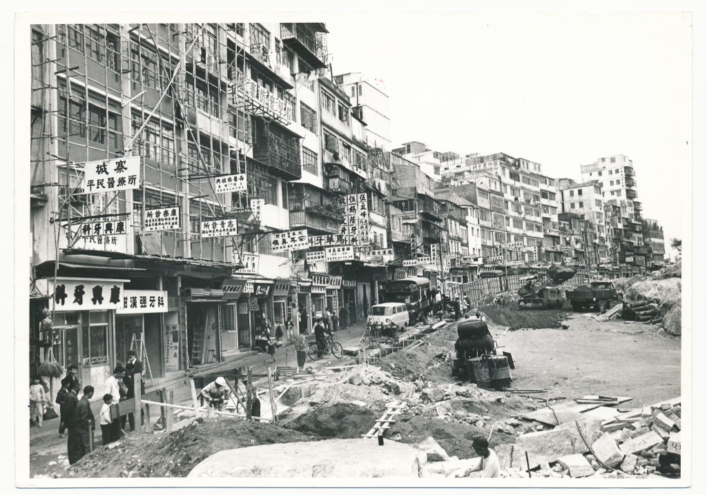 ▲七十年代,东头村道之新建楼宇,左边是中国领土,楼宇自由兴建,无牌牙科医生在此经营。