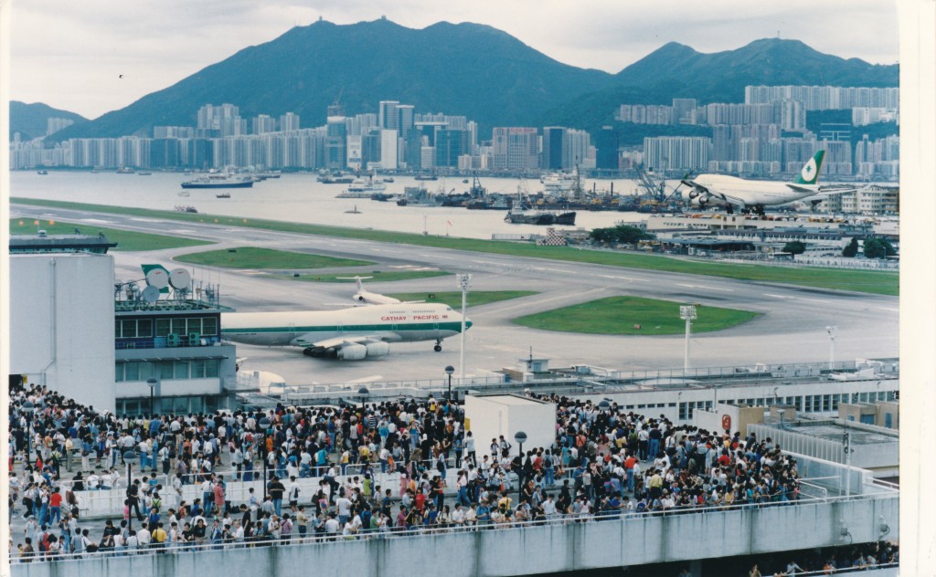 ▲启德机场关闭前瞭望台一带挤拥情景、远望启德机场跑道。