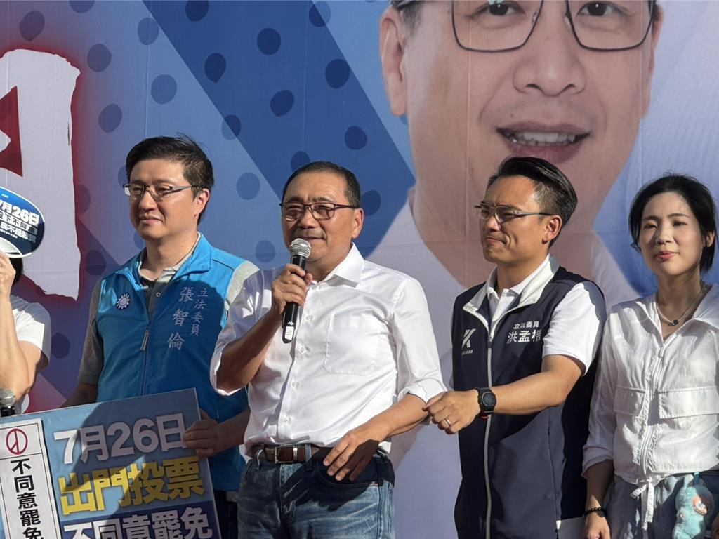 ▲新北市长侯友宜登台声援,批评民进党只剩40%民意,其余60%是沉默且善良的大多数,呼吁支持者726踊跃投票,用行动让执政者“怕起来”。中时新闻网