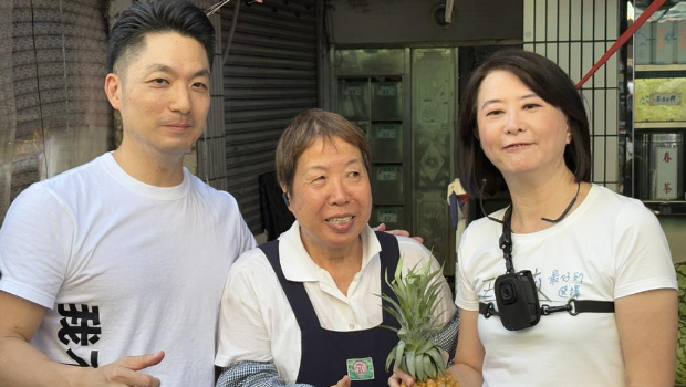 ▲台北市长蒋万安6日一早陪国民党“立委”王鸿薇扫街反罢,有许多摊商送上凤梨、炸鸡、花束。中时