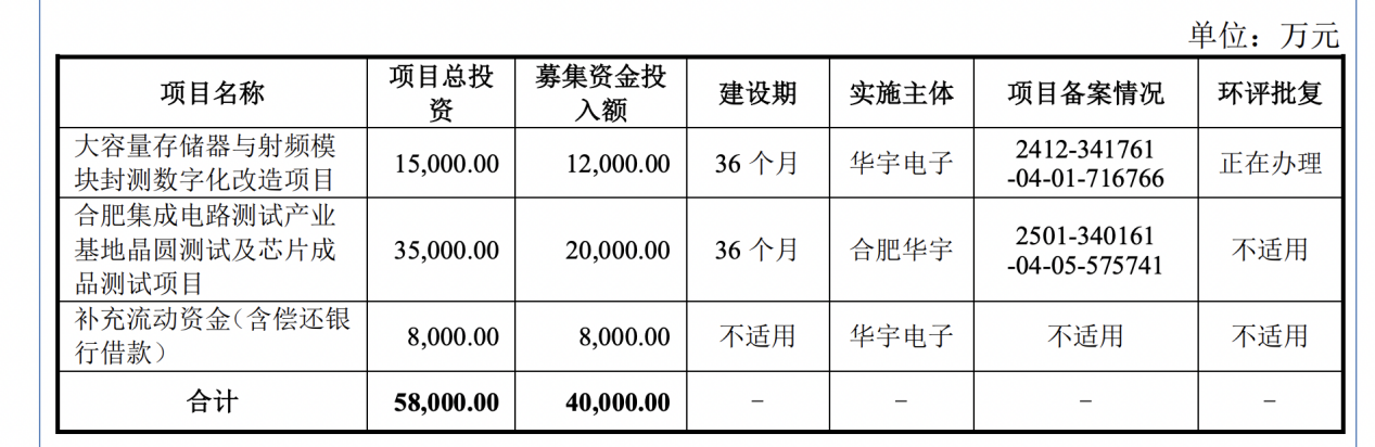 本次IPO,华宇电子拟募集资金4亿元,将用于大容量存储器与射频模块封测数字化改造项目、合肥集成电路测试产业基地晶圆测试及芯片成品测试项目、补充流动资金(含偿还银行借款)。