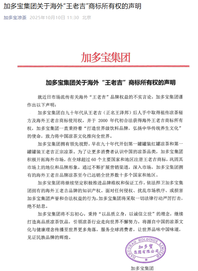 10月10日,“加多宝凉茶”微信号发布加多宝集团关于海外“王老吉”商标所有权的声明。声明称,加多宝集团自九十年代从王老吉后人手中取得祖传凉茶秘方及海外王老吉商标使用权,并于2000年代初合法获得海外王老吉商标所有权,已经在全球60个主要国家和地区注册了王老吉商标。
