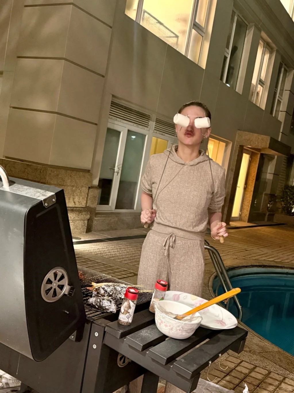 照片中见到何超莲在山顶超级豪宅烧烤,见到有鸡翼、肠仔、串烧外,何超莲更烤棉花糖时,拎起棉花糖遮住眼,非常有趣。照片中,见到大屋起码3层高,何超莲身后有巨型私人泳池,有指山顶豪宅面积达8,000平方呎,内部装潢华丽,更有健身房等设施。