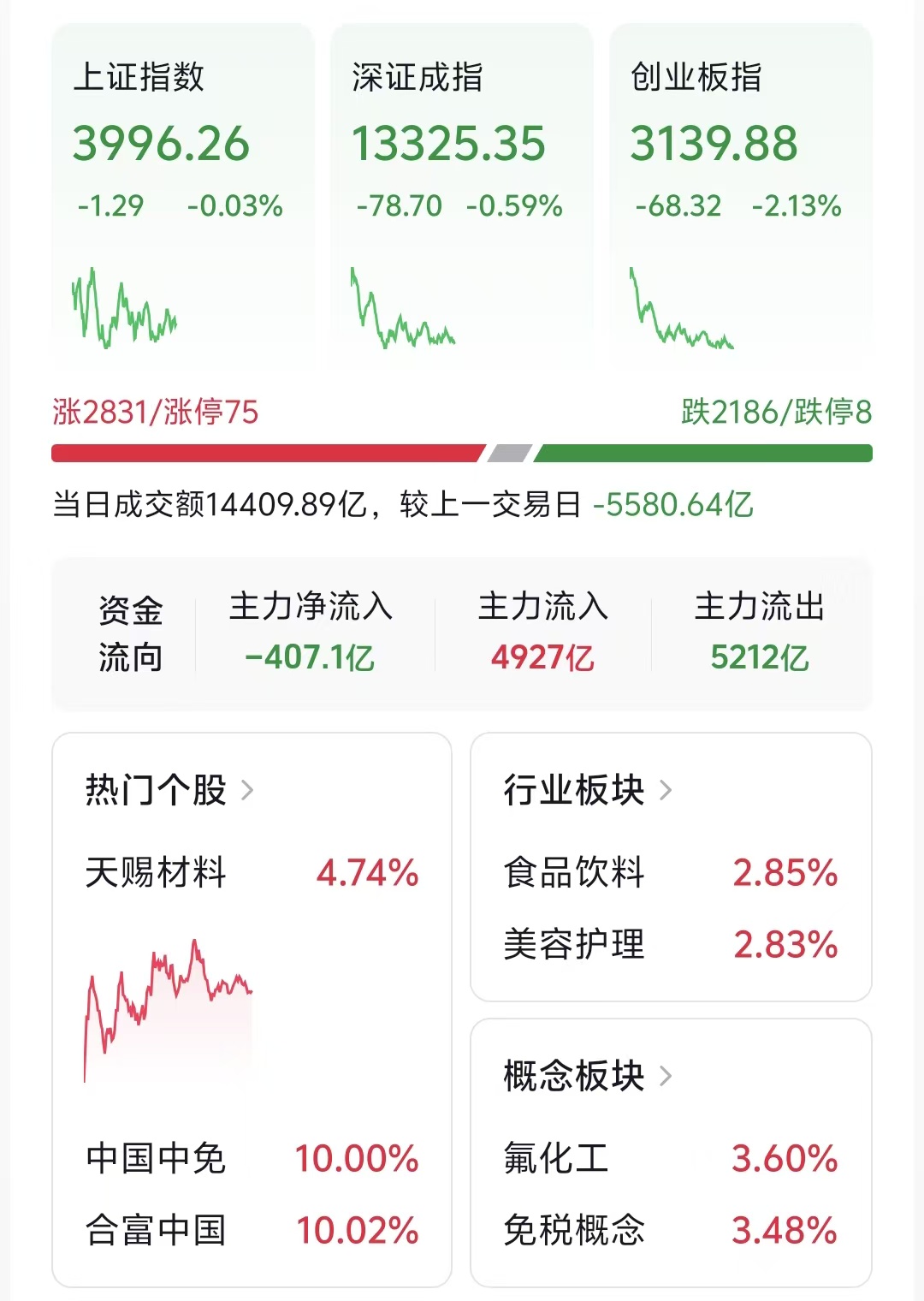 板块方面,大消费概念盘中拉升,食品饮料、免税方向领涨,欢乐家20cm涨停,三元股份、中国中免等多股涨停;磷化工板块延续涨势,粤桂股份、天际股份等多股涨停;光伏设备板块活跃,国晟科技、金辰股份等多股涨停;下跌方面,算力硬件股震荡走弱,立讯精密、长盈精密等跌幅居前;机器人概念下挫,浙江荣泰跌停。总体来看,个股涨多跌少,上涨个股超2900只。