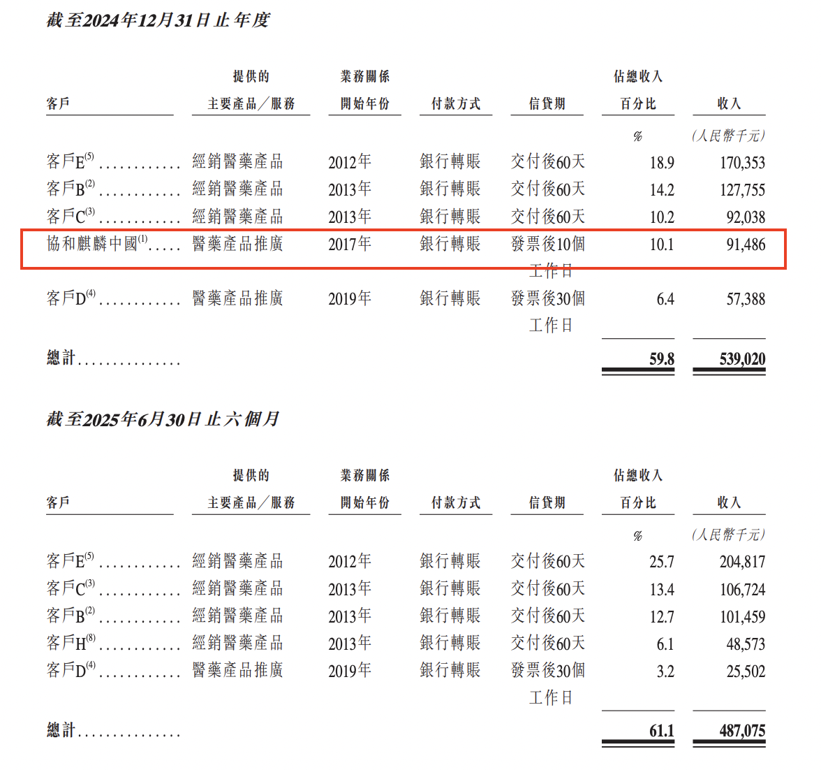 2022年-2024年及2025年上半年,维健医药来自各期间五大客户的总收入为4.35亿元、4.87亿元、5.39亿元及4.87亿元,分别占公司总收入的60.2%、54.8%、59.8%及61.1%。同期,公司来自最大客户的收入为1.09亿元、1.6亿元、1.7亿元及2.05亿元,分别占公司收入的15.0%、18.0%、18.9%及25.7%。