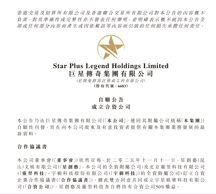 11月12日午间,巨星传奇(06683.HK)在港交所公告称,公司董事会宣布,11月11日,星创艺(昆山)文娱有限公司(公司全资附属公司)及北京灵翌科技有限公司(宇树科技全资附属公司)订立合资企业合作协议书,双方同意共同成立宇星娱乐科技有限公司。