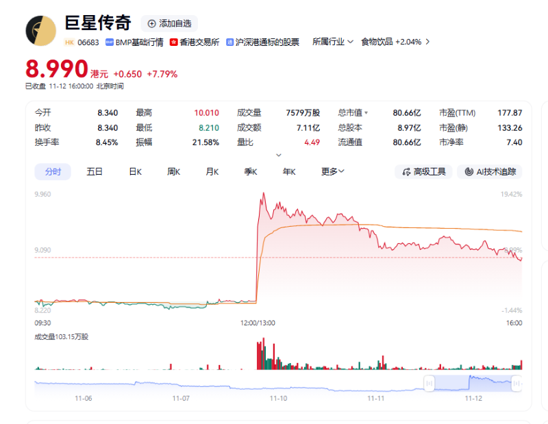受此消息影响,巨星传奇午后开盘直线拉升,盘中一度涨超20%,截至12日收盘,报8.99港元/股,涨7.79%,总市值80.66亿港元。