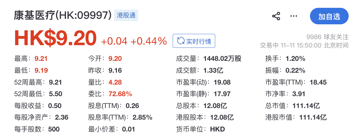 2020年6月29日,康基医疗在港交所主板上市,彼时以每股13.88港元的IPO发行价募资约35.98亿港元。截至目前,其每股收报9.2港元,较IPO发行价跌逾33.72%,目前市值约111.14亿港元。