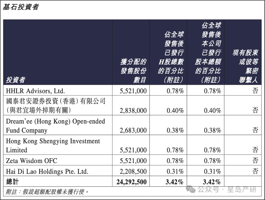 遇见小面此次上市招股共吸引六家基石投资者认购2429.25万股,合共认购2200万美元,共计占全球发售后总股本的3.42%,包括高瓴旗下HHLRA、君宜香港基金、国泰君安证券、Shengying Investmen以及海底捞新加坡等。