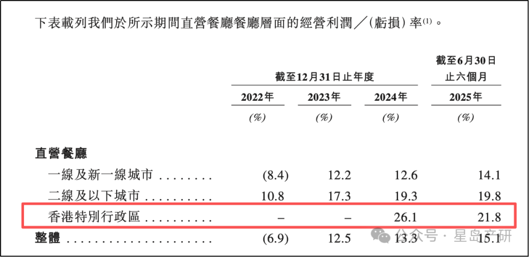 经营利润率显示的差距更为直观:2025年上半年遇见小面整体经营利润率为15.1%,其中内地一线及新一线城市为14.1%、二线及以下城市19.8%、香港门店达21.8%。