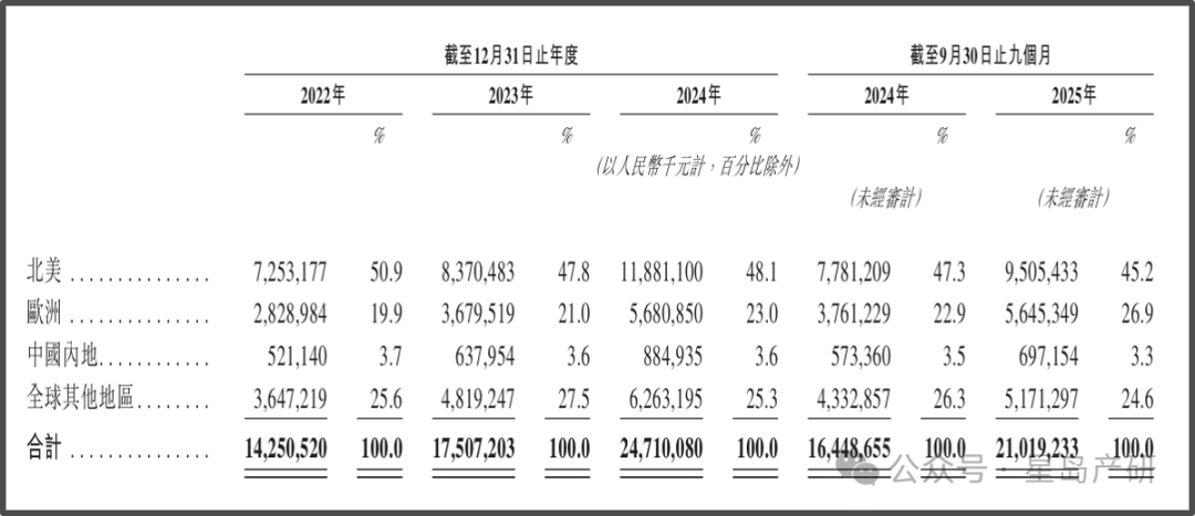 从地区分布来看,安克创新大部分收入来自北美及欧洲。2022年至2025年前三季度,来自北美的收入分别为72.532亿元、83.71亿元、118.81亿元及95.05亿元,分别占同期总收入的50.9%、47.8%、48.1%及 45.2%。