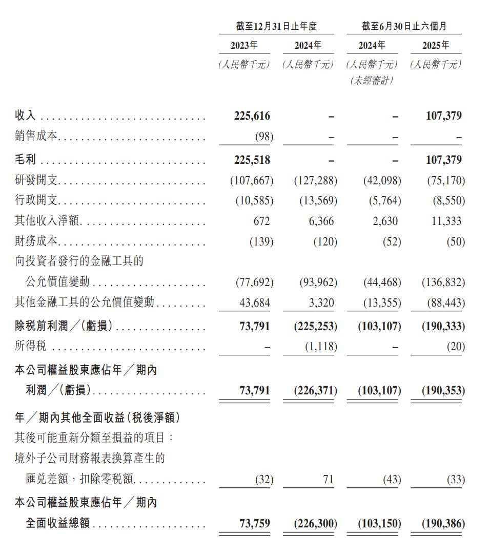 于2023年,公司因确认对外许可及合作安排相关收入而录得年内利润人民币7379.1万元。然而,于2024年以及截至2024年及2025年6月30日止六个月,公司分别产生年/期内亏损人民币约2.26亿元、1.03亿元及1.90亿元。该等亏损主要源于:(i)公司的营运开支(即研发开支与行政开支之和),(ii)向投资者发行的金融工具公允价值变动,及(iii)其他金融工具的公允价值变动。