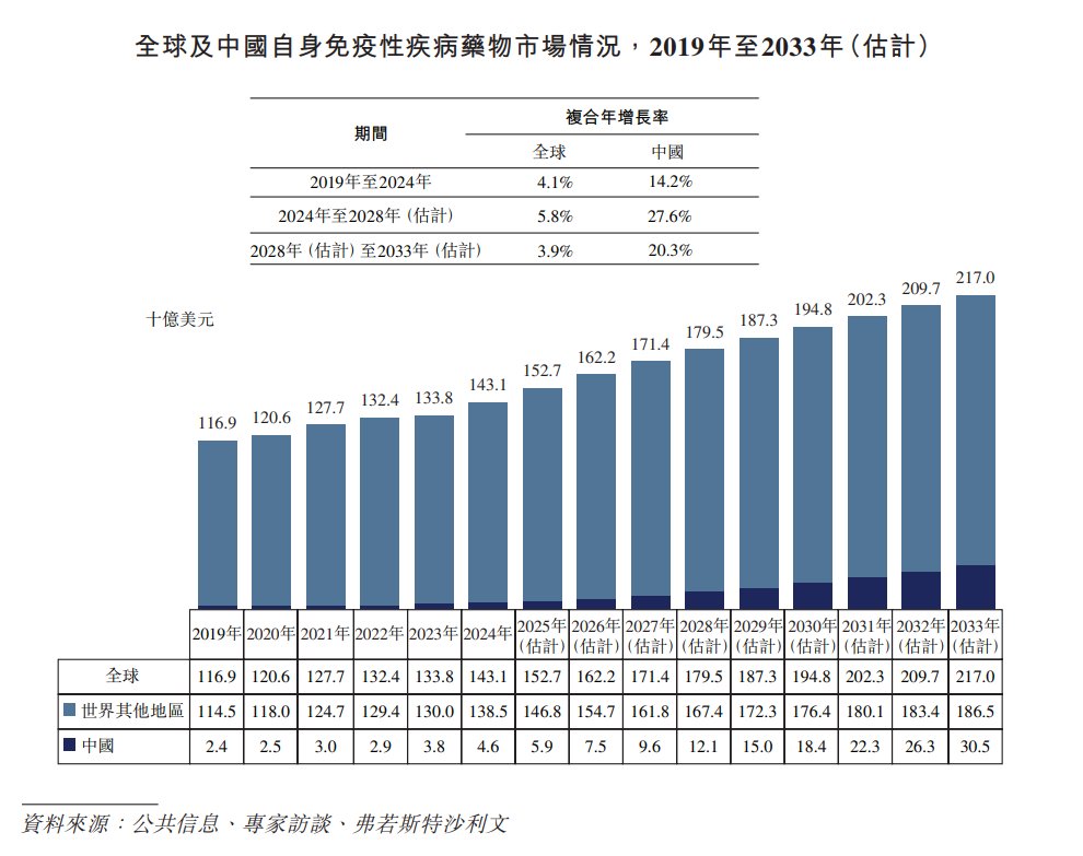 全球自身免疫性疾病药物市场规模从2019年的1169亿美元增至2024年的1431亿美元;预计到2028年将达到1795亿美元,到2033年将进一步攀升至2170亿美元,2024年至2028 年期间和2028年至2033年期间的预测复合年增长率分别为5.8%和3.9%。2019年至2024年期间,中国自身免疫性疾病药物市场规模从24亿美元增至46亿美元,复合年增长率为14.2%;预计到2028年将达到121亿美元,到2033年将达到305亿美元,2024年至2028年期间和2028年至2033年期间的复合年增长率分别为27.6%和20.3%。
