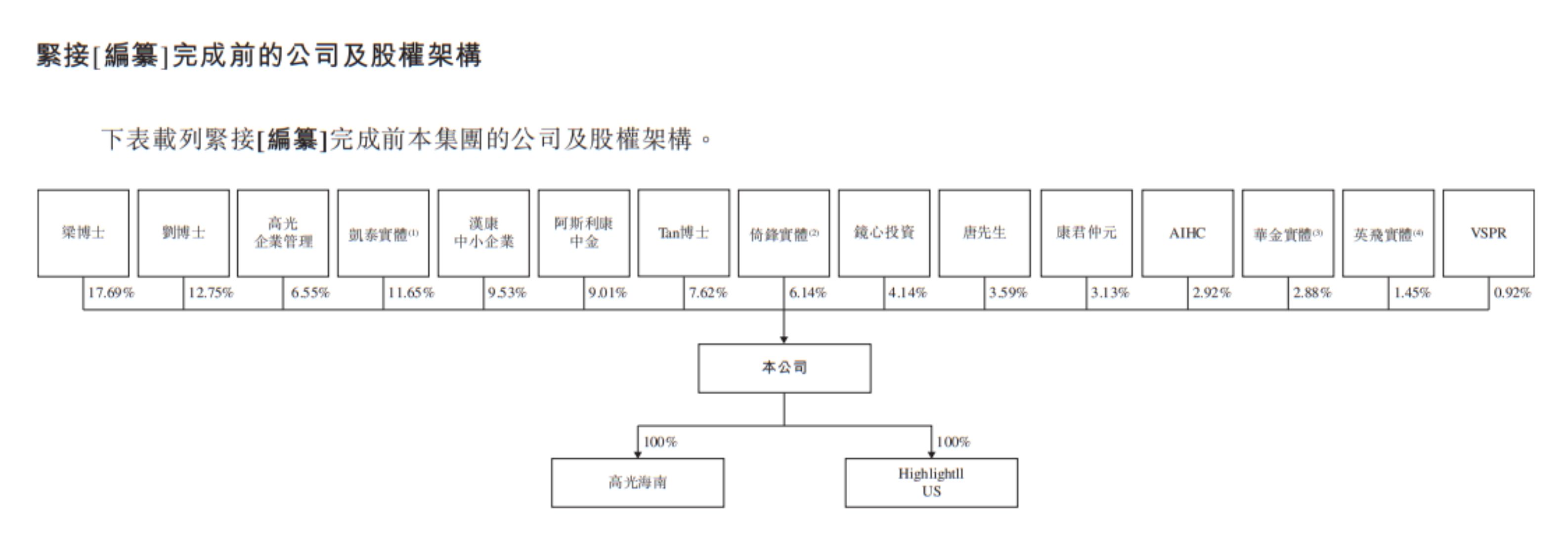 紧接[编纂]完成前,梁博士通过直接及间接方式(作为高光企业管理的普通合伙人及透过与刘博士及唐先生达成的表决委托安排)与唐先生共同控制本公司约40.58% 的表决权。因此,梁博士、唐先生及高光企业管理被视为公司于[编纂]前的控股股东。