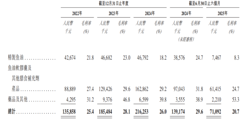 2022年及2023年,公司毛利率分别为25.4%、28.1%,2024年及2025年上半年,毛利率分别降至26%及20.7%,显示其盈利能力的下降,主要原因是公司使用了部分在价格下跌前以较高价格购买的毛鱼油,从而导致产品成本较高。