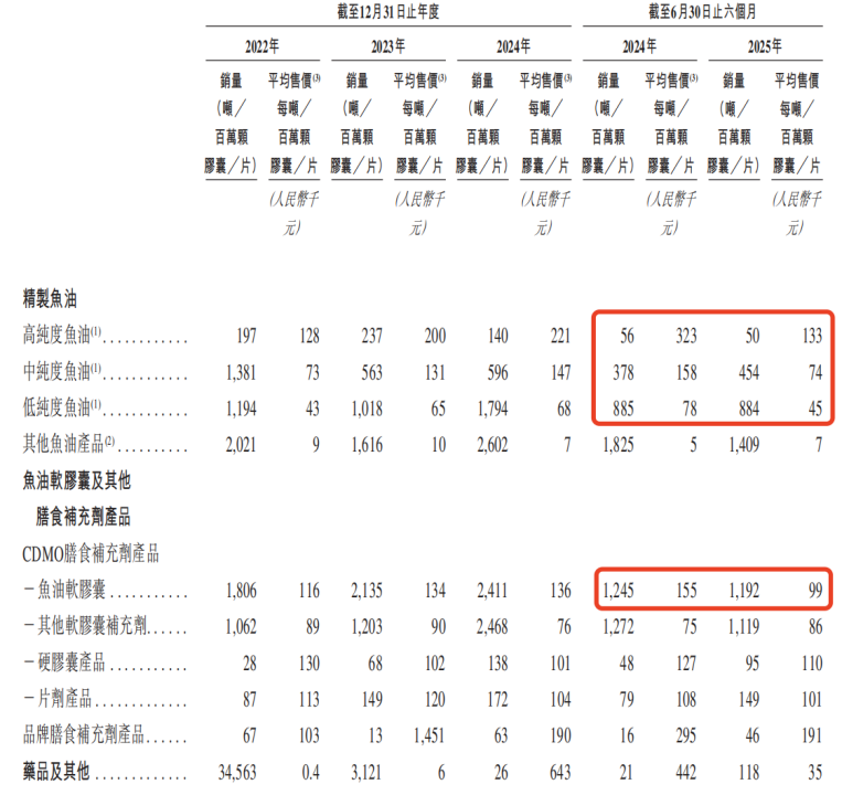 产品平均价格的大幅下降,却未换来销量的增长,尤其是鱼油软胶囊的销量,从2024年上半年的12.45亿粒降至2025年上半年的11.92亿粒。
