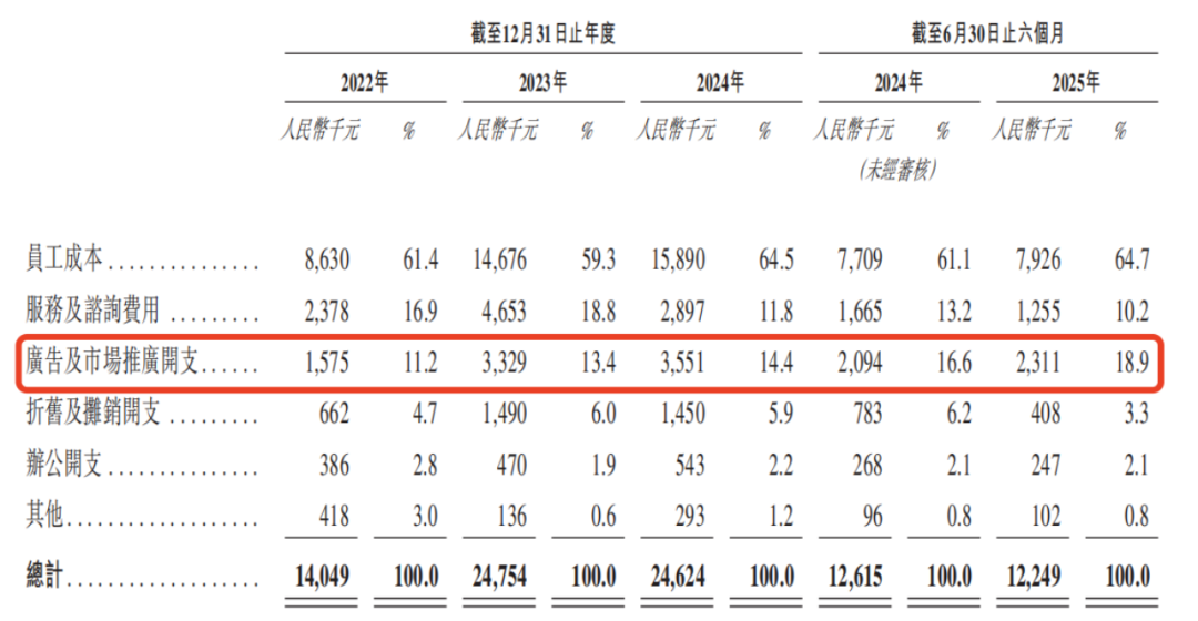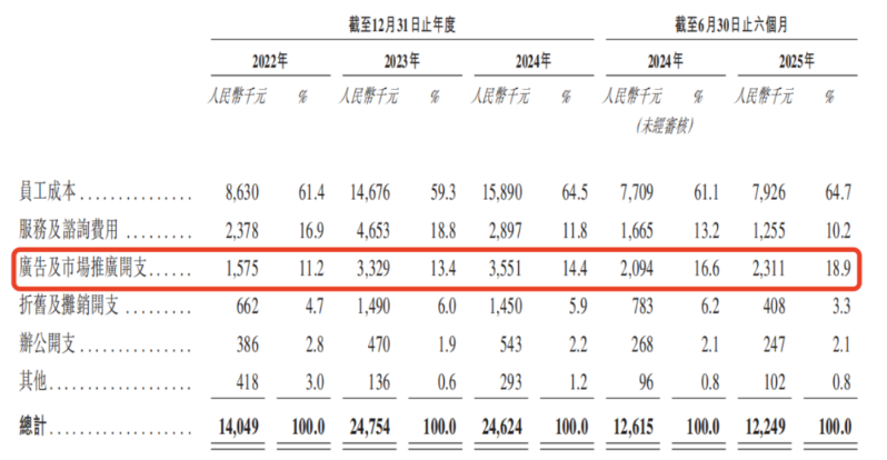 与此同时,禹王生物并未彻底放弃自主品牌推广。2022年-2024年,公司广告及市场推广开支由157.5万元逐年增加至355.1万元,同期,占总销售开支的比重由11.2%增加至14.4%,并于2025年上半年进一步增加至18.9%。