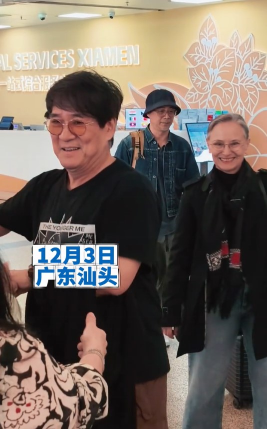 从机场影片可见,周华健一家人近日抵达广东汕头。当日周华健身穿黑色T恤配啡色阔裤,身型略有发福,脸上也带着明显的岁月痕迹,但精神相当饱满,心情极佳。他甫出闸口便热情地与粉丝握手,更兴奋得举高双手,活力十足。
