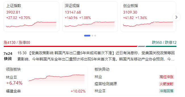 板块方面,大金融板块大幅拉升,瑞达期货、中银证券涨停;大消费板块走强,元祖股份直线涨停;稀土永磁板块短线拉升,宁波韵升直线涨停;福建本地股延续强势,红相股份(维权)20cm涨停,东百集团、三木集团等多股涨停;算力硬件股震荡走强,致尚科技、长光华芯双双20cm涨停;下跌方面,医药板块表现疲软,广济药业(维权)、粤万年青下挫。总体来看,个股呈普涨态势,上涨个股近4400只。