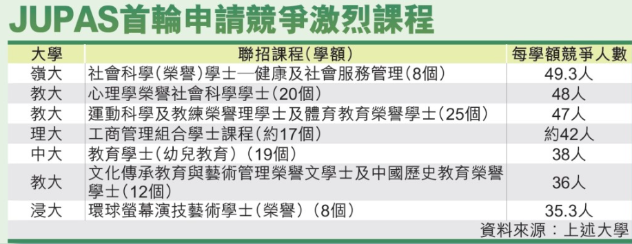 大学联招(JUPAS)首轮申请日前截止,8间资助大学昨日公布受欢迎课程的首三志愿(Band A)申请人数,其中,竞争最激烈的课程为岭南大学的“社会科学(荣誉)学士 - 健康及社会服务管理”,约49.3人争1个学额。其次为香港教育大学的“心理学荣誉社会科学学士”,约48人争1个学额。教大的“运动科学及教练荣誉理学士及体育教育荣誉学士”课程同样热门,约47人争1个学额。