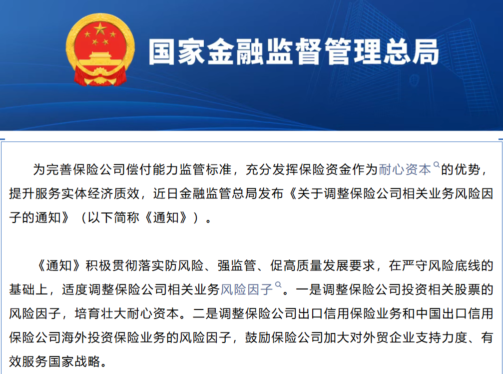 有市场人士解释称,简单说,调低保险公司的风险因子,相当于直接降低保险公司的风险资本占用,给险企资金松绑,从而为他们腾挪出更多的可投资资金,故被资本市场解读为利好消息。