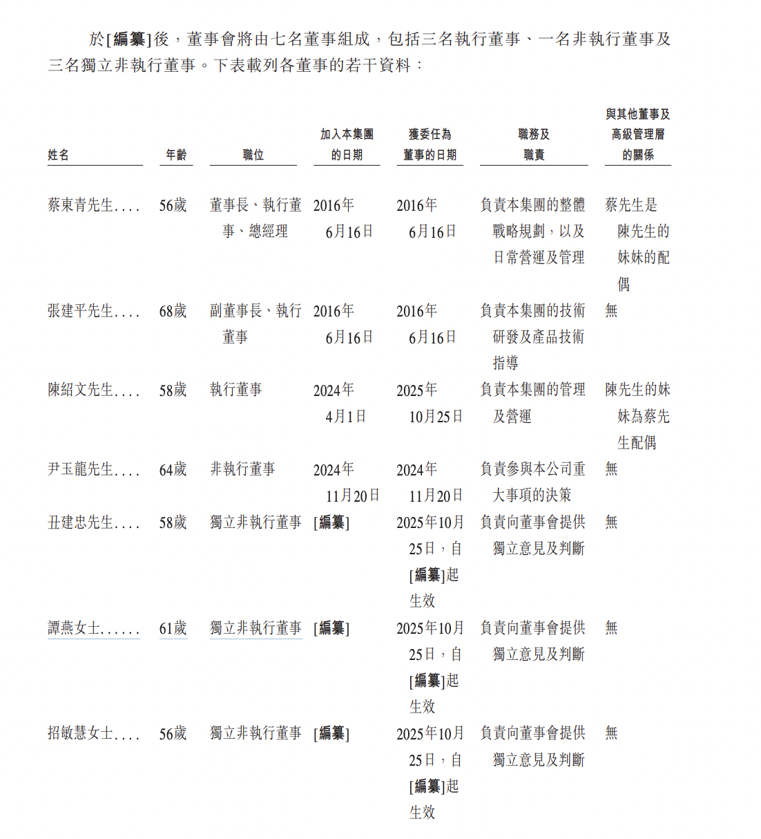 瑞财经注意到,陈绍文、丑建忠、谭燕、招敏慧均自2025年10月25日获委任为董事。陈绍文的妹妹为蔡东青配偶。