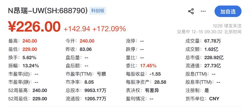 12月16日,昂瑞微(688790.SH)在上交所科创板挂牌上市,保荐机构为中信建投,开盘涨172.09%,总市值228.92亿元。