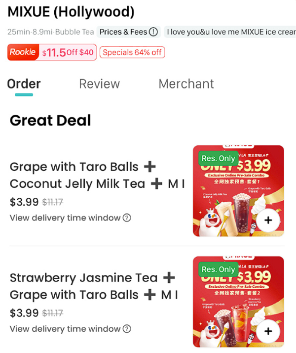 这两款套餐定价均为3.99美元(约合人民币28元),其中包括芋圆葡萄、椰果奶茶及冰淇淋或草莓果茶、芋圆葡萄及冰淇淋,预售套餐限购一份,目前店铺内暂未有其他产品及价格信息。