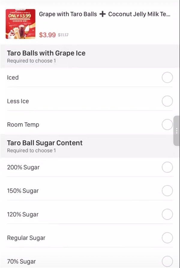 值得注意的是,在套餐选择饮品糖度时,除了常规的正常糖、七分糖、五分糖、三分糖、无糖的选项外,还有120%糖度、150%糖度、200%糖度可选,以适应当地消费者的口味。