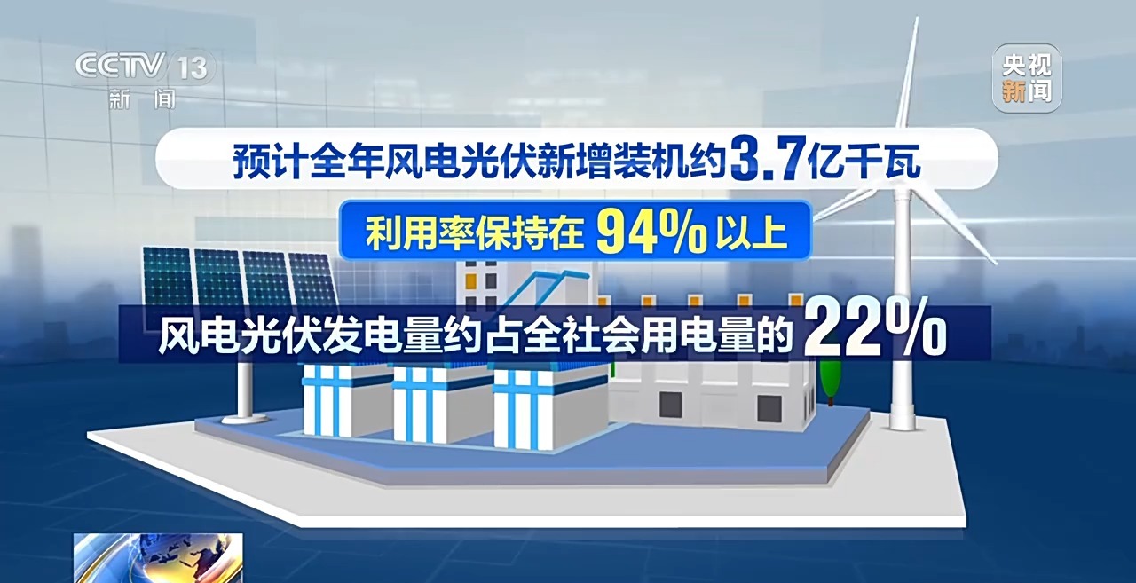 新能源实现更高质量跃升式发展。目前,我国第一批风电光伏基地基本建成投产,第二批、第三批已建成投产约5000万千瓦,预计全年风电光伏新增装机约3.7亿千瓦,利用率保持在94%以上,风电光伏发电量约占全社会用电量的22%。