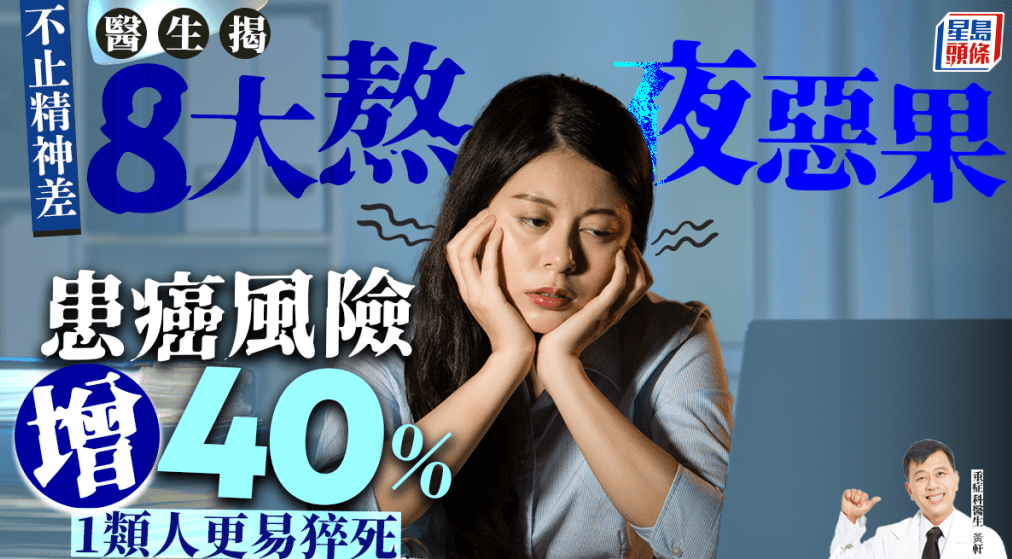 【熬夜坏处】不少港人都有熬夜习惯,不过经常熬夜不止会令精神转差。有医生指出,熬夜的代价远比想象中更可怕,长期熬夜者的患癌风险比早睡者高出40%,到底日常应如何戒除熬夜的坏习惯?