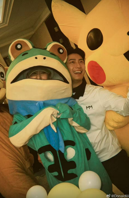 ▲何超莲穿绿色青蛙玩偶装,为老公窦骁生日制造惊喜。