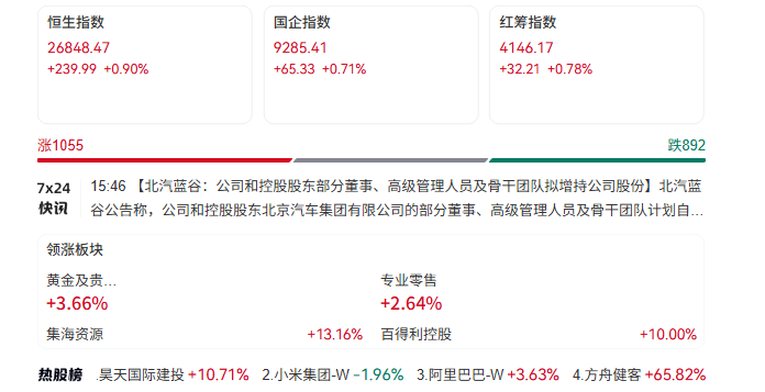 1月13日消息,港股三大指数集体上涨。截至收盘,恒生指数涨0.9%,报26848.47点,恒生科技指数涨0.11%,国企指数涨0.71%。