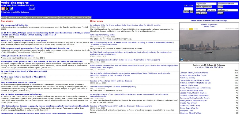 David Webb透露,自2003年以来,营运数据库的花费已超过1,000万元,当中未计他个人花费大量时间的机会成本,“我知道该数据库对记者、监察者、研究人员及投资者都很有用。”翻查资料,早在1998年,当时32岁的David Webb退休,并且创立非牟利网站“Webb-site”,专门更新上市公司企业信息,即使网站设计简洁,但因为数据量丰富且具公共性,吸引不少金融界、传媒界以至投资者浏览,并作为索引及重要参考。