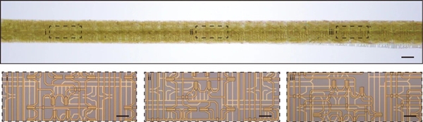 经过近五年时间,团队先后攻克了高分子表面平整化、耐溶剂侵蚀、形变下电路稳定等多个技术难题,最终成功制备出具有信息处理功能的“纤维芯片”。