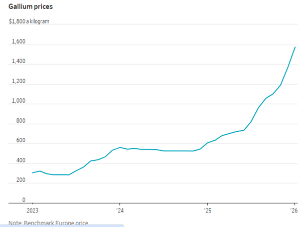 行情数据显示,过去两年间,国际基准的鹿特丹低纯度镓价已上涨了近三倍。根据Argus Media的数据,今年1月平均价格创下每公斤约1572美元的历史新高。