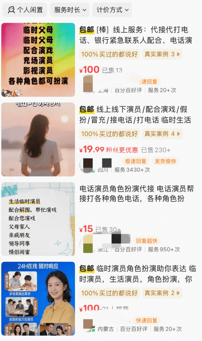 ▲在某二手交易平台,多个商家挂出“专业演员假扮情侣”业务。